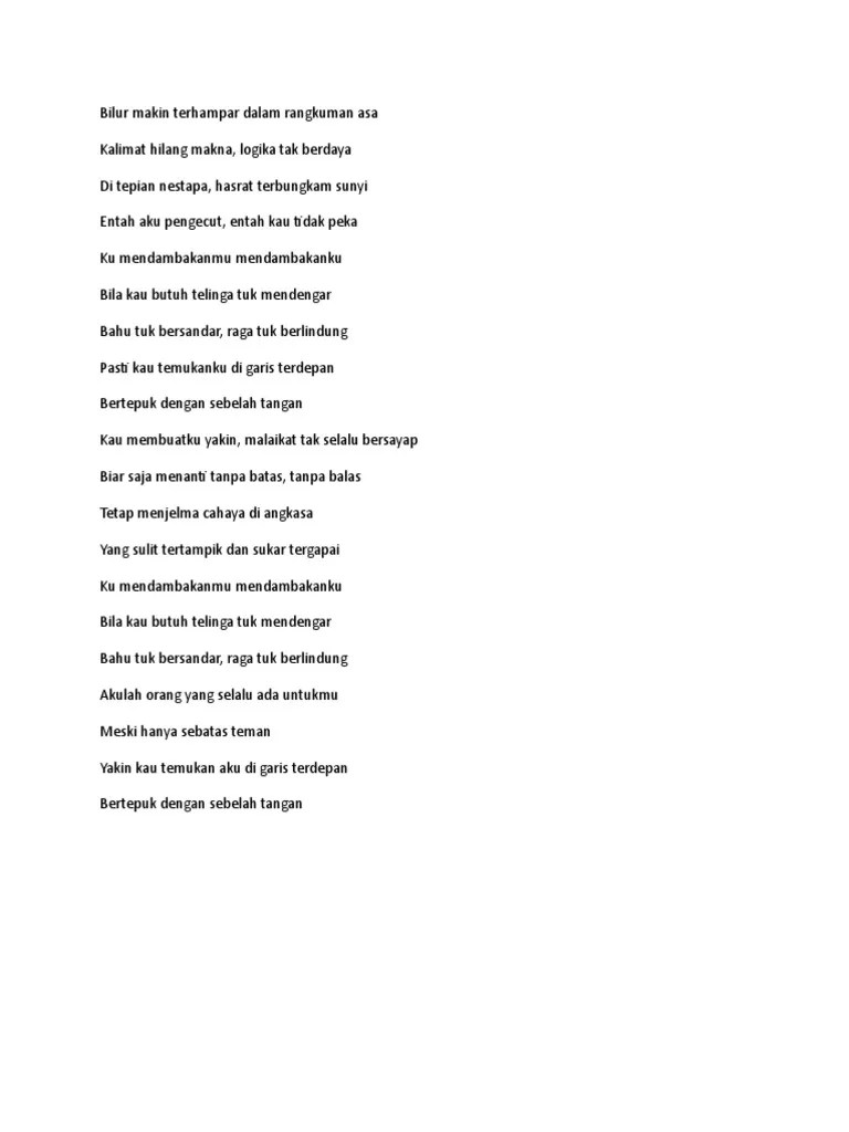 Bila kau butuh telinga tuk mendengar. Pasti kau temukan aku di garis terdepan. Download lagu gratis, gudang lagu mp3 indonesia, lagu barat terbaik. Bila kau butuh telinga 'tuk mendengar. Bila kau butuh telinga tuk mendengar, bahu tuk bersandar, raga tuk berlindung, pasti kau temukan aku di garis terdepan meski hanya sebatas teman.